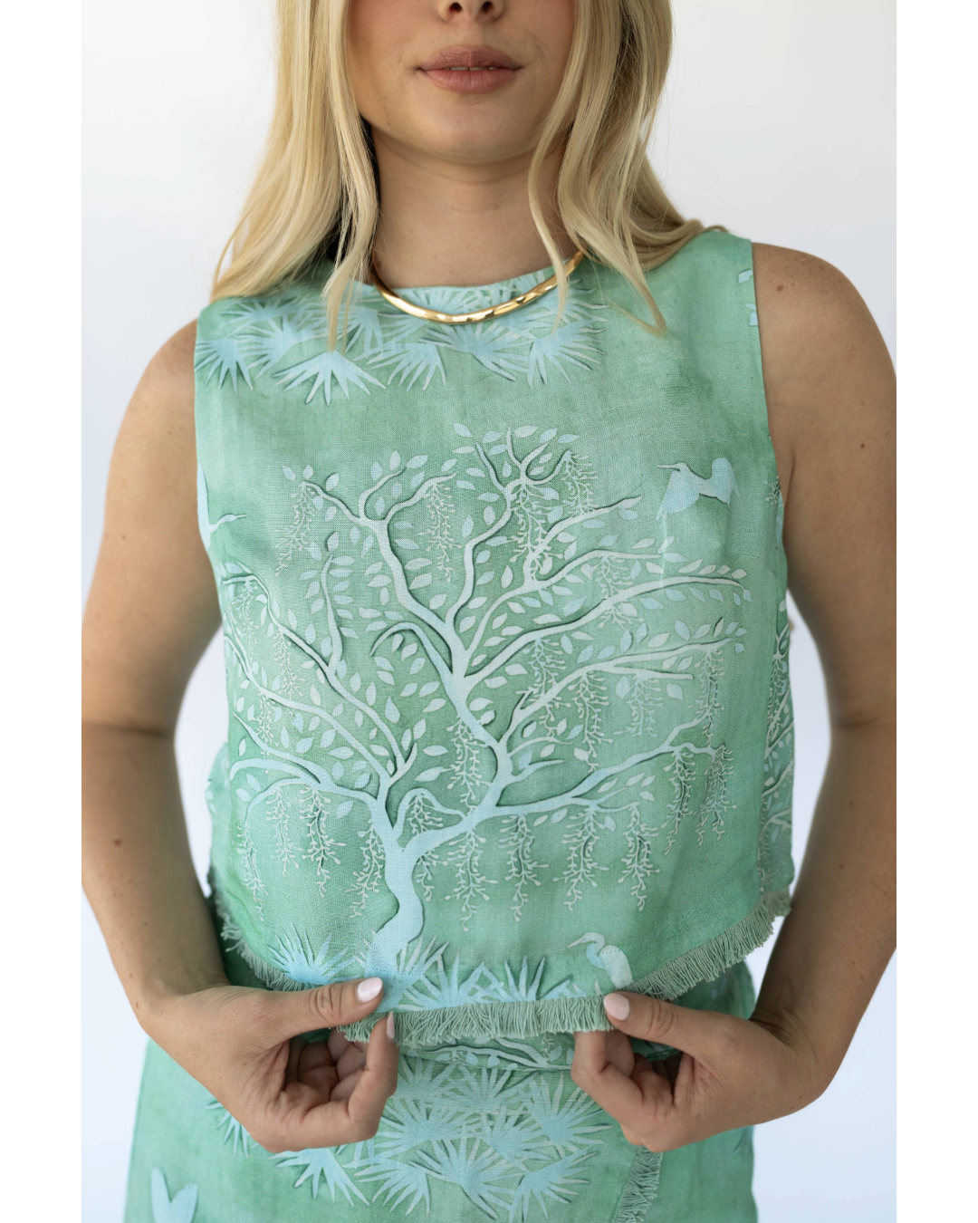 The Alice Top is an updated classic shift top. Featuring a cotton fringe hem detail, keyhole back, and an easy cropped length. Pair with the Michelle Faux Wrap Skirt or the Florence Maxi Skirt in the Green Lowcountry Watercolor for a polished set.