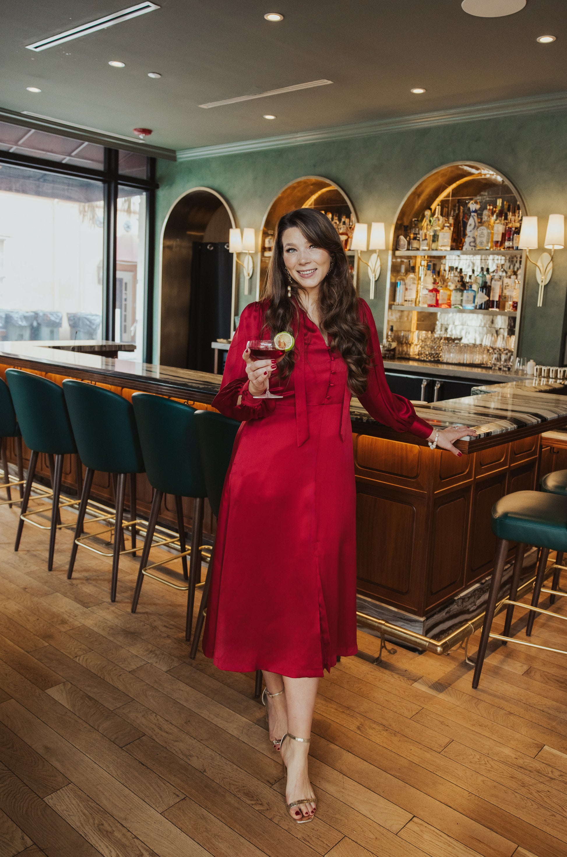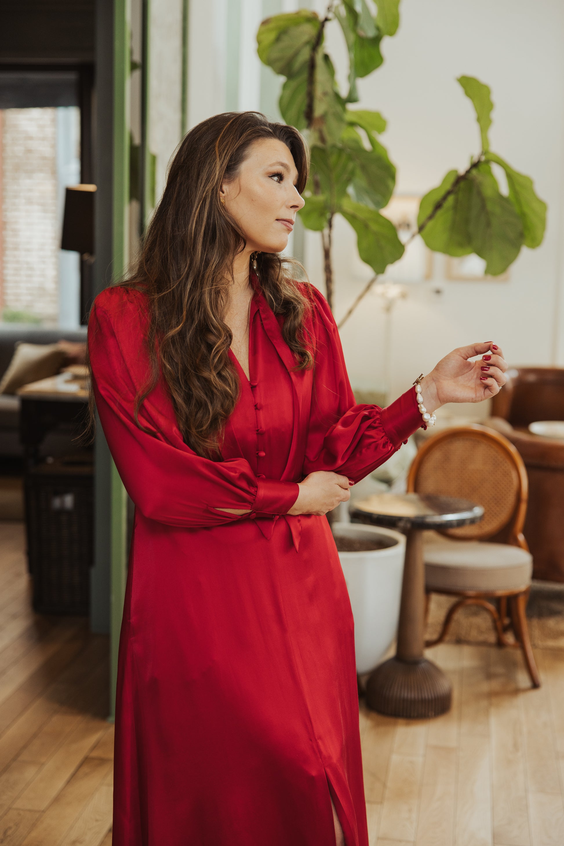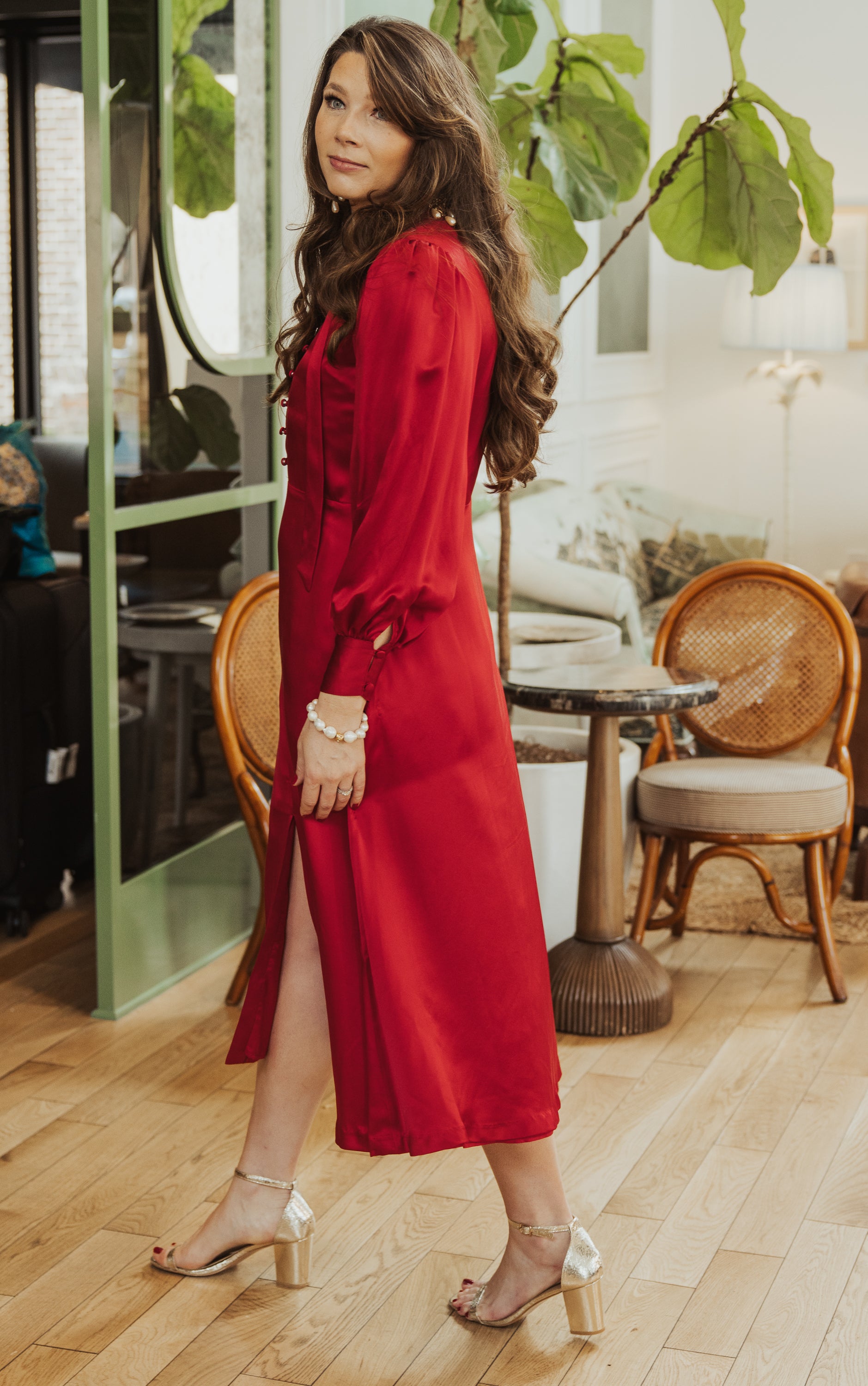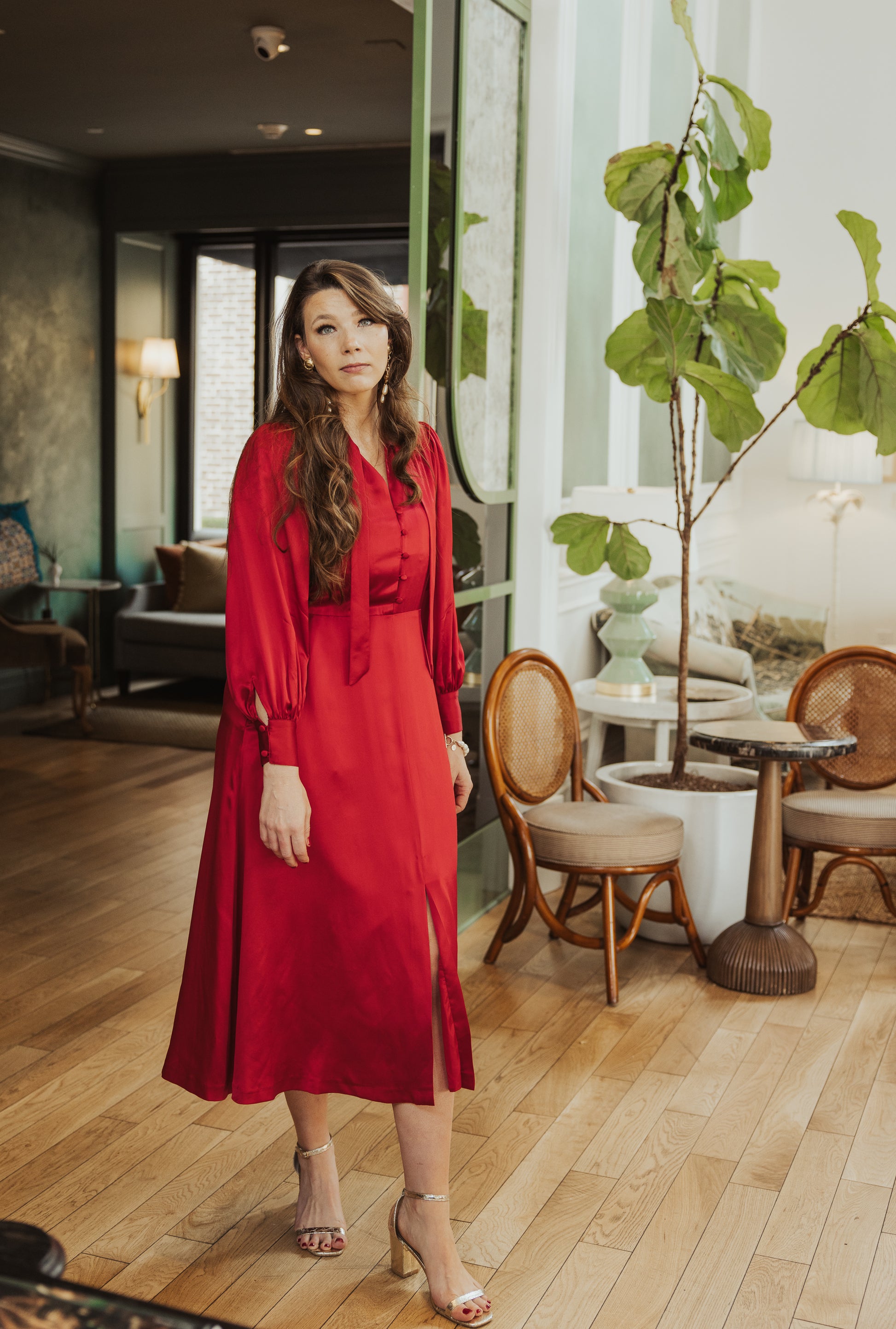 The perfect holiday hostess dress! The Samantha dress is figure-flattering, timeless, and sophisticated. Featuring a front slit and pockets, it's sure to be a wardrobe favorite.